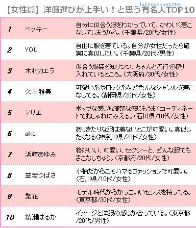 至於女性方面,经常搭配色彩鲜艳饰品的ベッキー名列首位,“知道什麽样的服装适合自己,将自己表现的很可爱”,大家对於她在色彩以及个性方面的准确把握深表佩服。而YOU不问男女都获得了高支持,排名第2位,有男性评价道“自由的穿著服装不露刻意的痕迹,如果我是女性的话一定会模仿她的”。