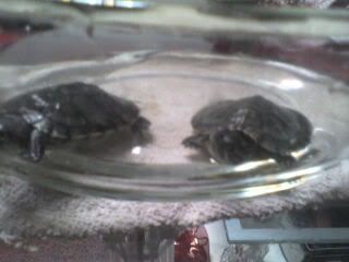 手机拍的,不是很清楚,这是俩人刚来的样子,那时侯俩人还只是在我家金鱼淘汰了的小缸里扑腾呢……后来俩人搬到豪华别墅去了……可惜没照片了-V-|||||