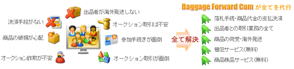 サービスの概要 | 海外から日本のオークションに参加するというのは非常に手間が掛かってしまうのと同時に、IDの取得、出品者とのメール取引作業、限定された決済方法等々多くの問題が 現実問題として山積です。そんな時に便利なのが「オークション落札代行サービス」です。 決済方法・出品者による取引方法の制限など一切気にすることなく日本のオークション上で気に入った商品を探して、サービスを申し込むだけで日本のオークション出品商品が簡単に手に入れることができます。バゲッジフォワードコムの落札代行サービスはオークション 落札から海外発送までトータルでサポートします。 |