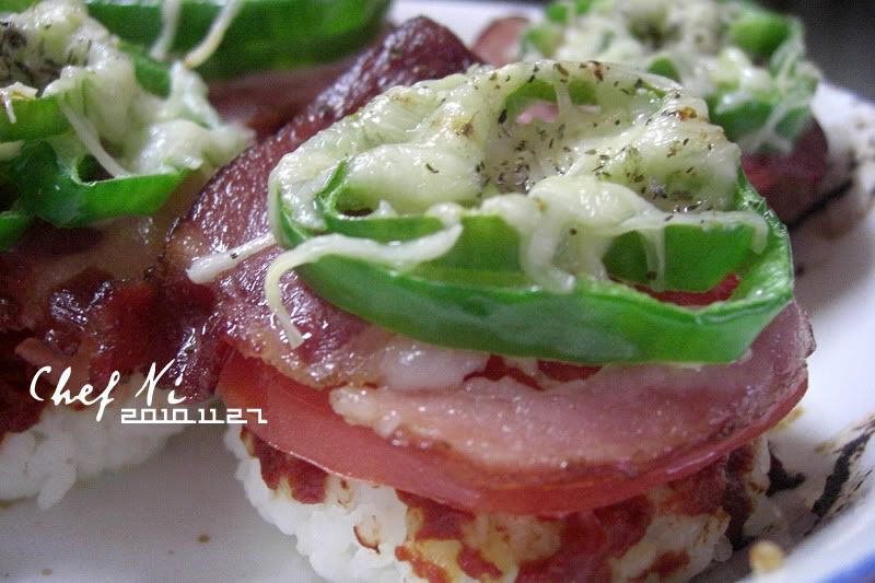 ?从上至下,以此是芝士、青椒、培根、番茄、番茄酱、米饭团=V=
