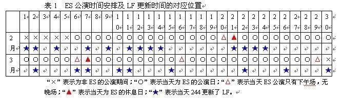 Love Fighter(LF)为堂本刚(244)先生的网络日志名称,主要内容是244自己的心情日记。Endless Shock(ES)为堂本刚的相方堂本光一(51)先生每年惯例演出的舞台剧的名称。ES的演出时间从06年2月6日至06年3月29日,排练时间从06年1月开始。具体时间安排如下表: